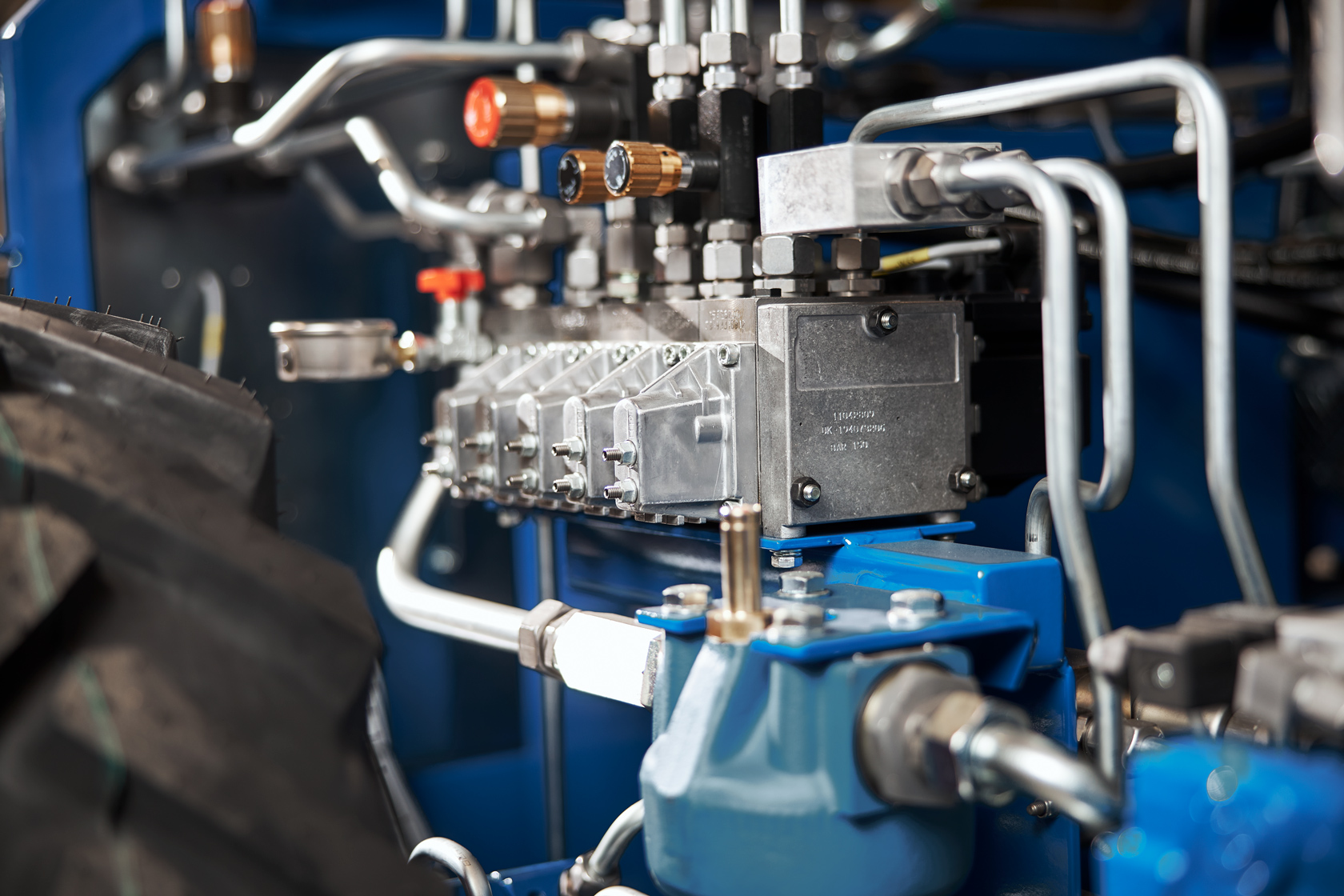 The principal structure of the machine consists of a collectinghead system, operated by hydraulics. The conveyer is adjustable up to 21 or 24 metres and the central unit comes with four-wheel drive.